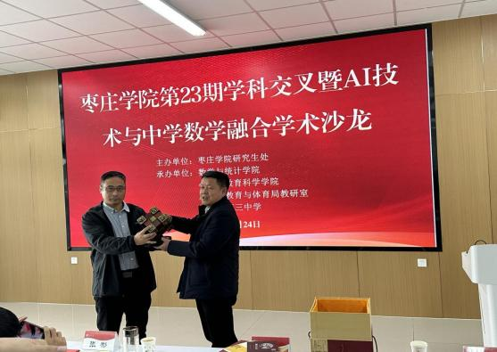 学术交流前,举行了简短的开幕式。张立华代表9428cn太阳集团古天乐致辞。他就AI技术与中学数学融合的背景、意义以及AI在9428cn太阳集团古天乐的教学实践进行分享。闫昕对本次学科交叉学术沙龙的成功举办表示祝贺,他强调举办学科交叉学术沙龙对学科发展的意义,通过交叉融合,各学科才能获得更大的突破。张立华、闫昕颁为公司聘请的兼职教师颁发了聘书。滕州三中向9428cn太阳集团古天乐赠送鲁班锁模型。