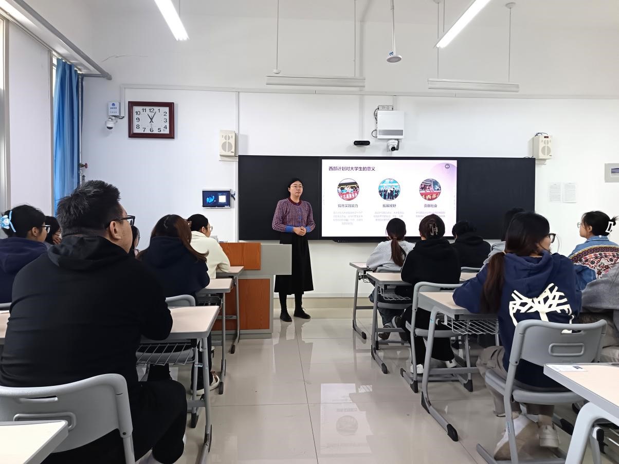 韩晓瑞老师以详实的数据为依托,针对西部计划的内涵以及相应的招募条件进行了细致解读,重点讲解了西部计划的主要服务内容。系统分析了老员工投身西部计划的优势,深入剖析了其在个人成长与未来发展层面的积极意义和显著价值,并从西部计划政策的实施与成效入手,详细介绍了西部计划的资金保障。活动最后,韩晓瑞鼓励同学们积极参与,以实际行动响应国家号召,为西部发展贡献力量。