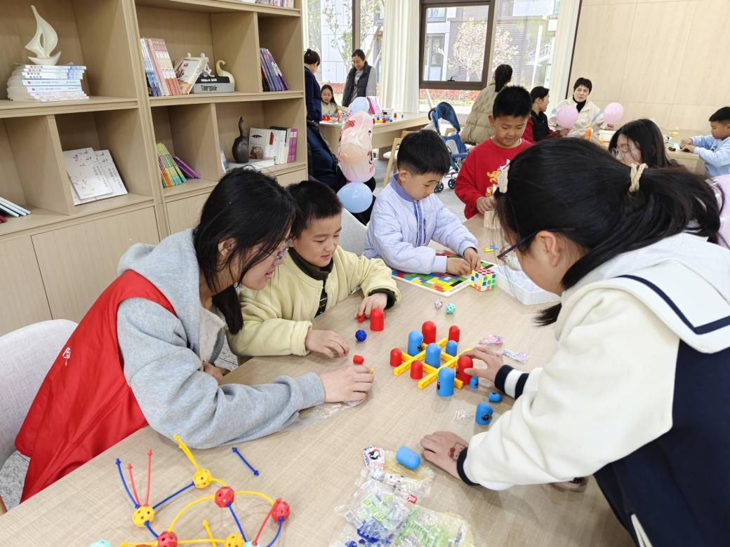 活动中,志愿者们为社区中的小员工开展数学课兴趣培养工作,他们通过PPT讲解数学的趣味知识与实际应用,并带领孩子们体验魔方、华容道、七巧板等益智游戏,以寓教于乐的方式展现数学魅力,在互动中培养数学思维,激发学习兴趣。