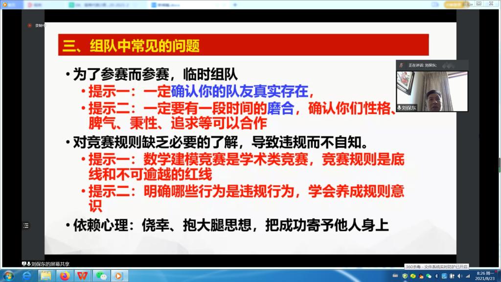 828上午数学与统计公司邀请全国老员工数学与建模竞赛山东赛区专家组组长、山东大学硕士生导师刘保东教授,在线上作专题报告,数学与统计公司、信息科学与工程公司、人工智能公司全体建模指导教师以及全校参赛员工参加报告会。报告会由数学与统计公司经理吕长青老师主持。