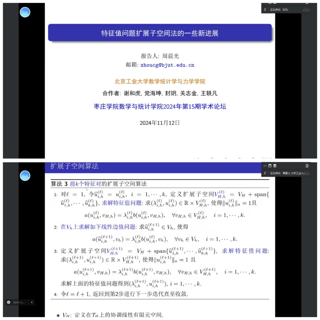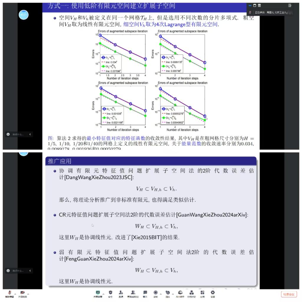 报告提出了求解特征值问题的扩展子空间法及其多水平校正法该方法通过构造一个特殊的扩展子空间,巧妙地将细网格上特征值问题的求解转化为细网格上线性边值问题的求解和扩展子空间上特征值问题的求解,该方法具有一致收敛速度和最优计算复杂度的算法。最后,周晨光博士介绍特征值问题扩展子空间法的一些新进展并与参加此次学术论坛专任教师进行了研讨