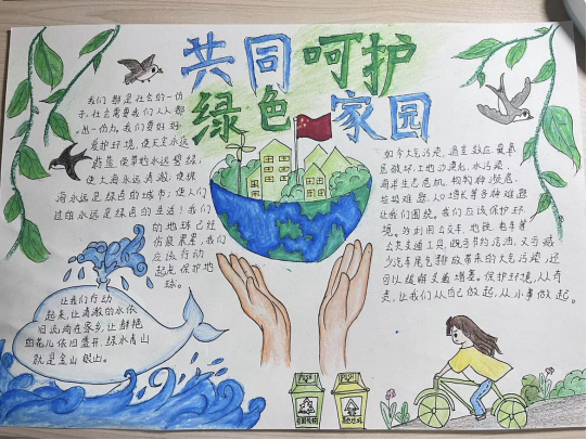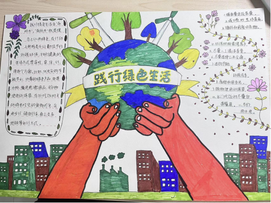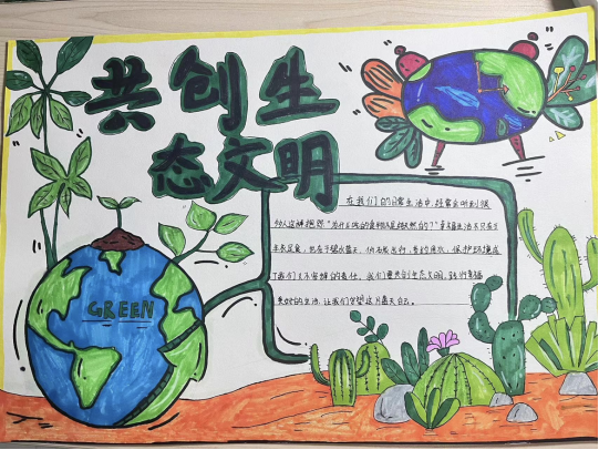 植树造林,种下的既是绿色树苗,也是祖国的美好未来。 低碳环保,节约的既是有限资源,也祖国的发展时间。人人出力,植绿不止,在尺寸之功中累积绿色能量,共同铺好绿色发展的底色,必将让盎然绿意滋养生态文明的土壤,使祖国大好河山都健康,使中华民族世世代代都健康。本次共创生态文明,践行幸福生活手抄报比赛和板报活动,普及环保知识,让同学们增强环境保护意识,倡导环保理念,提高环保意识,充分发挥同学们在创建绿色校园中的重要作用。