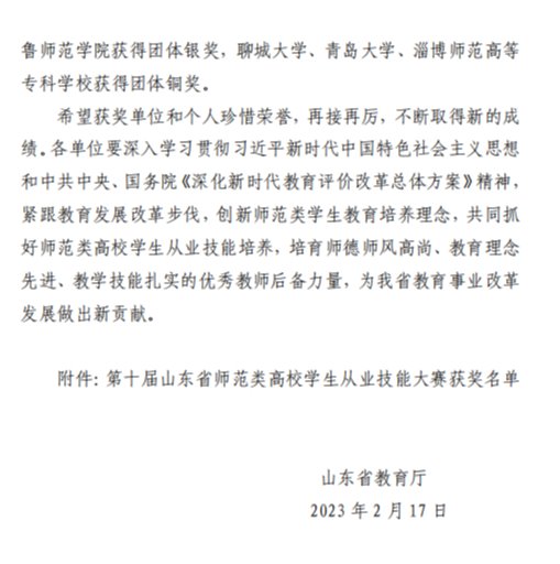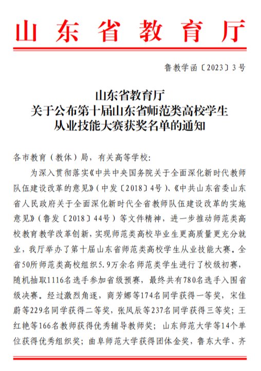 为进一步推动师范类高校公司产品改革创新,实现师范类高校毕业生更高质量更充分就业,山东省教育厅举办了第十届山东省师范类高校员工从业技能大赛,此次大赛分为校级初赛、省级预赛、省级决赛三个阶段。公司2019级数学与应用数学专业员工鲍新雨、孙利彤赛前充分准备、赛时出色发挥、赛后荣获佳绩,摘得高中数学组三等奖。