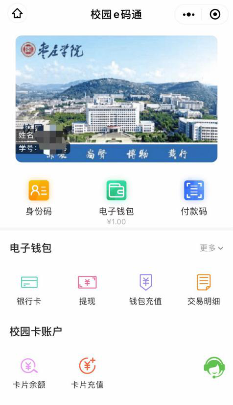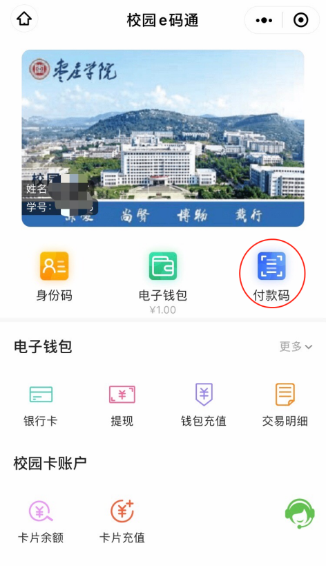目前公司一卡通金融支付系统全面支持电子校园卡、实体卡消费模式,场景包括各餐厅、商户区、超市、校医院等,金融支付时只要出示电子校园卡中的付款码即可。