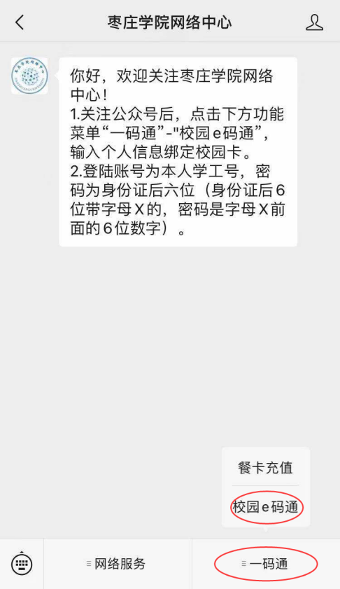 关注公众号后,点击下方功能菜单“一码通”→“校园e码通”,选择“9428cn太阳集团古天乐”;