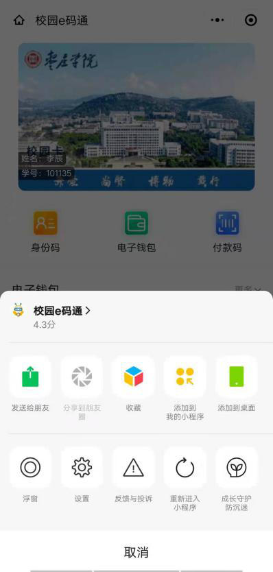 在此界面可点击右上角“。。。”,选择“添加到桌面”或“添加我的小程序”,方便下次使用。